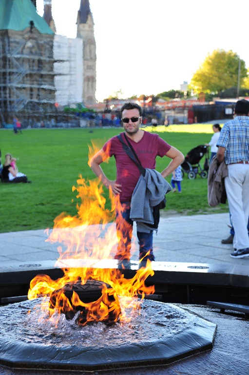 JC avait un peu froid malgré 23 degrés, il se réchauffe près d’une fontaine enflammée “flamme du centenaire”