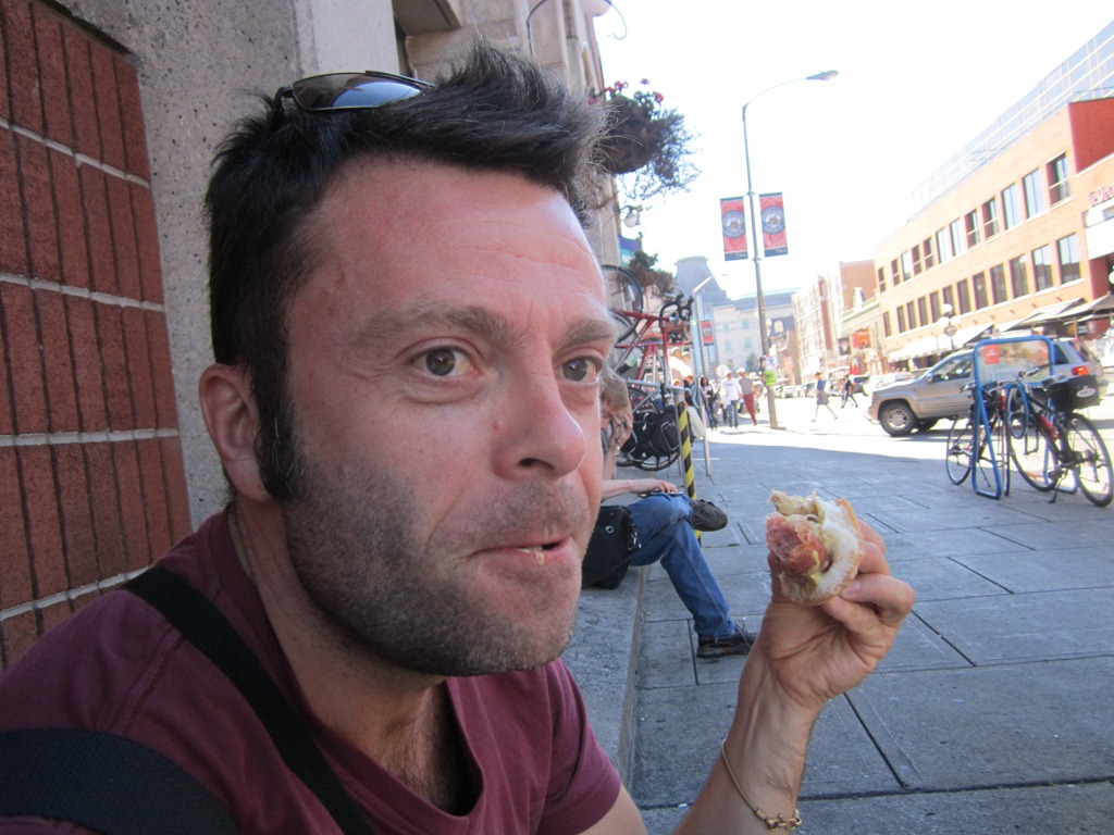 Nous avons un petit creux. Nous cherchons à manger sur le pouce et optons pour un Hot-dog, pardonnez nos mimiques !!!! Le hot dog est un aliment léger (ça c’est pour pépère) et très digeste…
