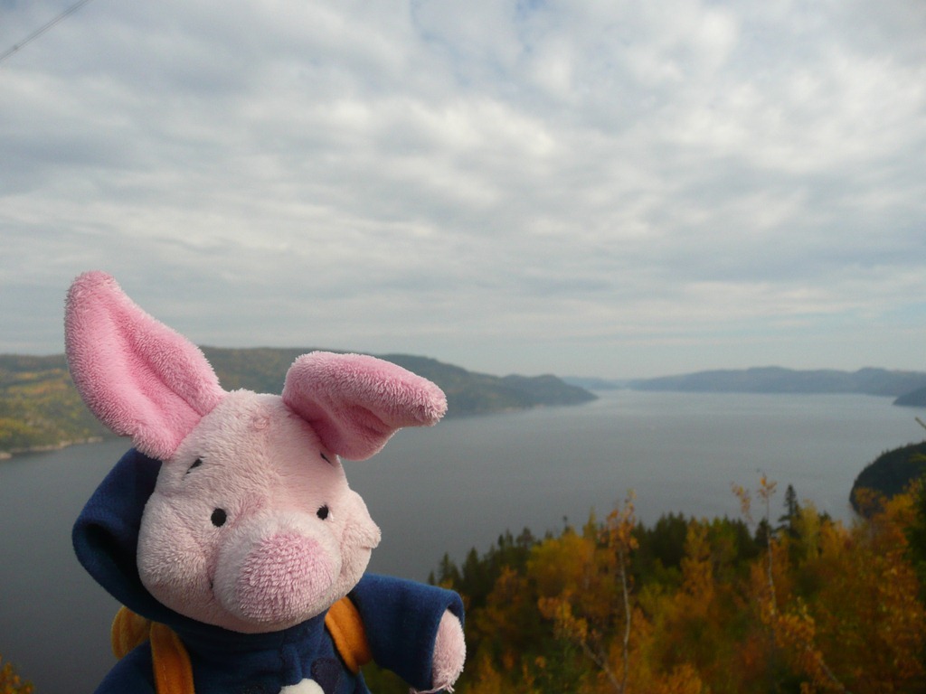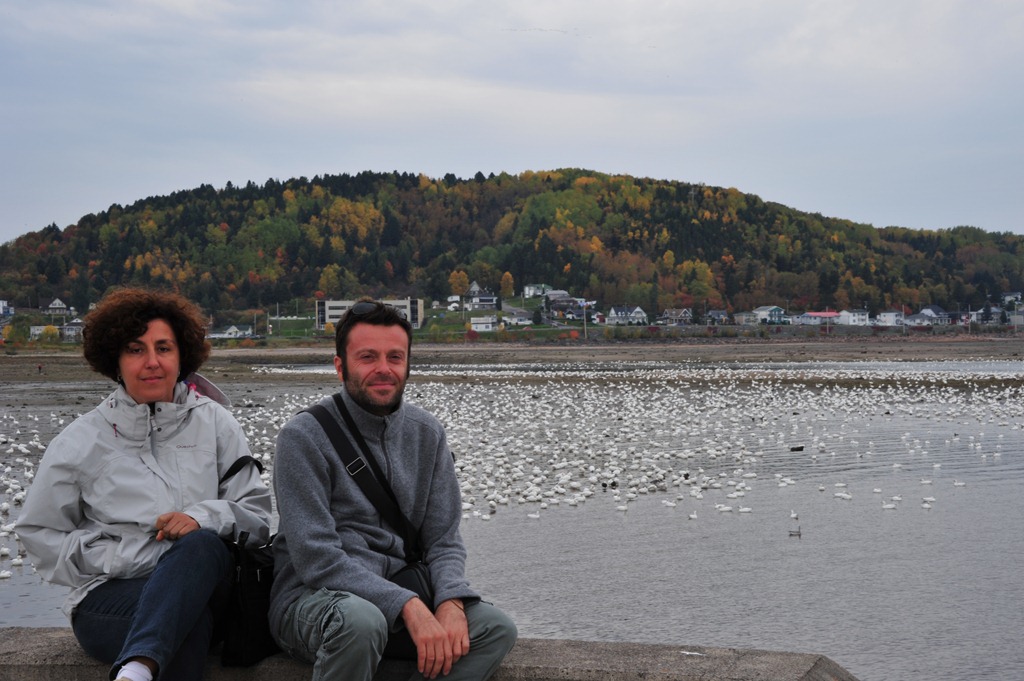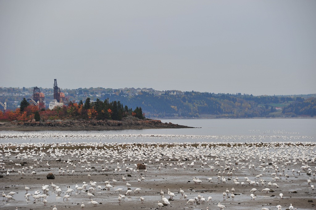 Nous quittons le gite sous une petite bruine et nous prenons la direction de Saguenay et de son fameux Fjord. Là, il ne pleut plus. C’est une étape pour nous ainsi que pour les oies et les autres espèces qui migrent vers le sud (Miami beach ou les Caraïbes ?). Nous observons des nuées d’oiseaux qui atterrissent sur le début du Fjord.
