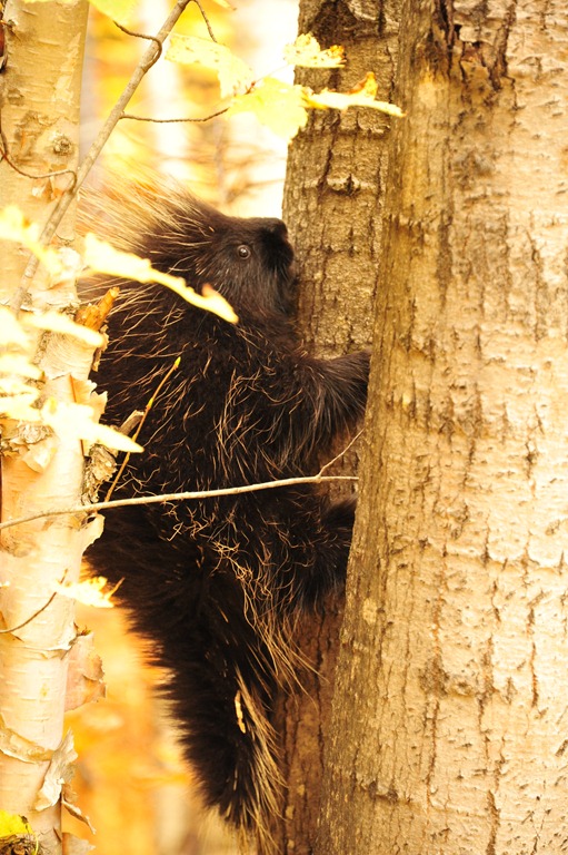 Au détour d’un virage, nous apercevons une peluche noire en bordure de route qui après avoir traversé celle-ci, voulait retourner dans la forêt. Complètement affolée et apeurée par notre présence et après avoir difficilement grimpé le talus (on l’aurait bien aidé en lui poussant les fesses), elle décide de monter à un arbre pour nous fuir…Il s’agissait d’un beau “porc-épic” (beaucoup plus habile pour grimper aux arbres que pour franchir les talus, ceci nous a permis de l’observer un bon moment).