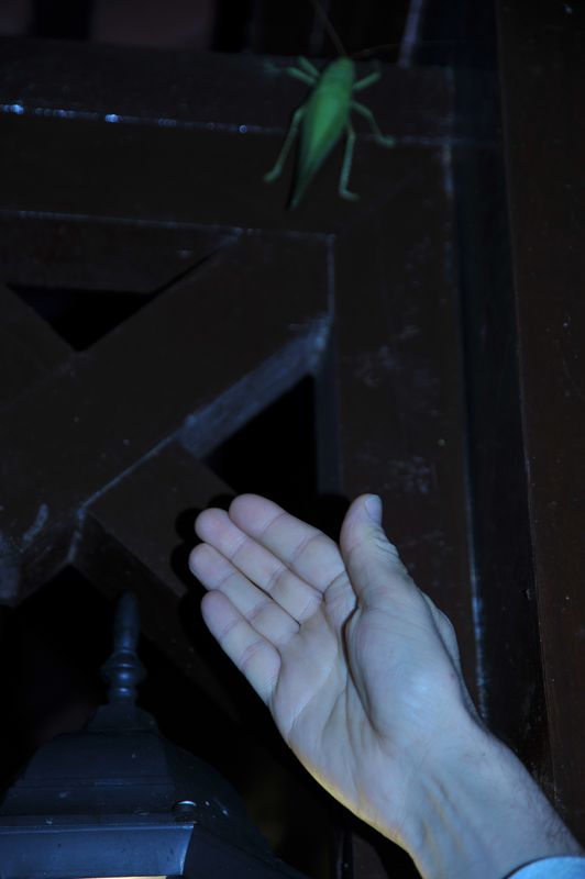 Le temps du dîner va être un grand moment de découverte du monde animal et plus spécialement des coléoptères. Un gros scarabée volant atterrit dans les cheveux de Christine avant d’être projetée sur la table, pour finir entre les mains expertes de la jeune serveuse qui, le trouvant appétissant, le porte dans un même mouvement vers la cuisine toute proche. Nous n’en verrons pas la couleur, les gourmets ont du se garder l’insecte pour eux (et ils auront eux raison !). Plus tard, c’est au tour d’une grosse bête verte de nous impressionner, elle est telle une sauterelle, verte et pattue seule la taille diffère : elle est énorme, grande comme une main !