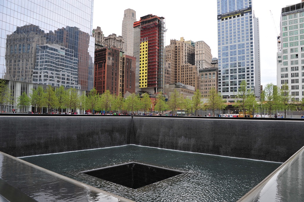 Nous passons ensuite au milieu des deux emplacements des anciennes tours. A leurs places se trouvent deux bassins noir avec le long des parois des chutes d’eau de 9m ruissèlent vers un orifice central représentant les abysses. Ces bassins sont entourés de panneaux en bronze où sont gravés les noms des victimes de l’attaque du 11 septembre 2001.