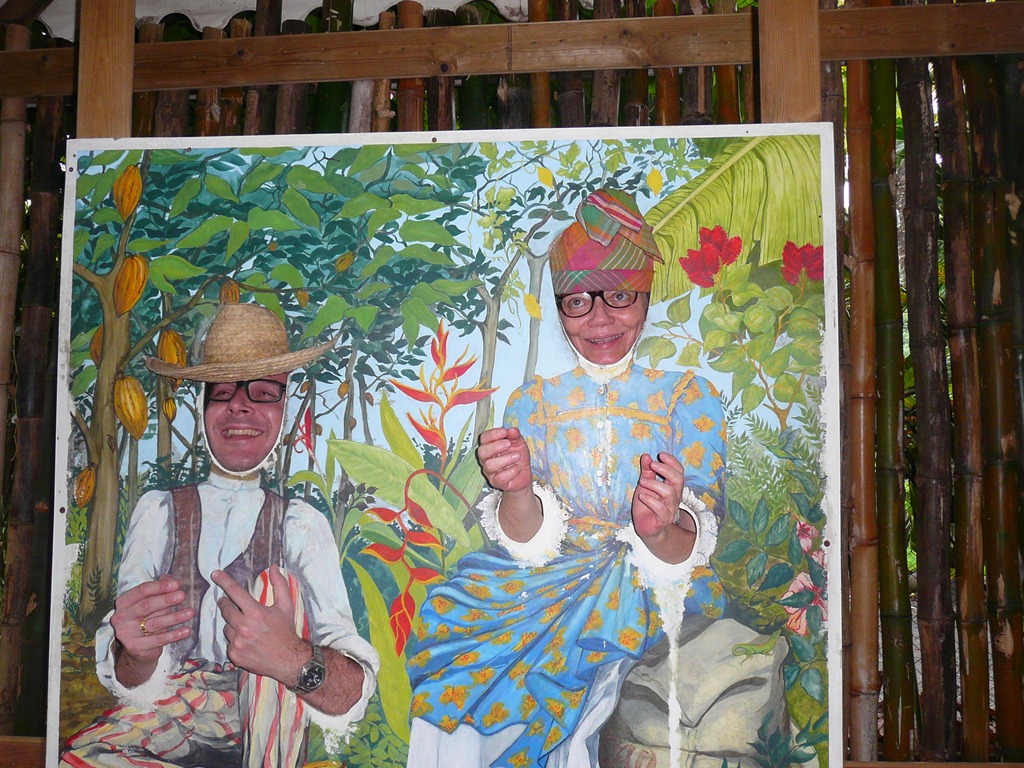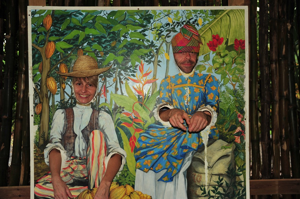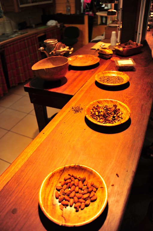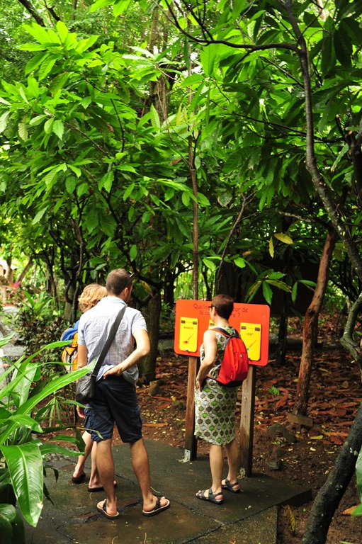 Ensuite, nous nous regroupons pour assister aux explications de la transformation de la cabosse de cacao jusqu’au chocolat. Cela durera 2h avec tout au long dégustation de la fêves de cacao en passant par un cacao (cacao + sucre + eau) et différents chocolats (100%, 90%, au gingembre, piment, café, maniok) et même de la liqueur de cacao. Passionnant et l’animatrice une sacrée personne !!!