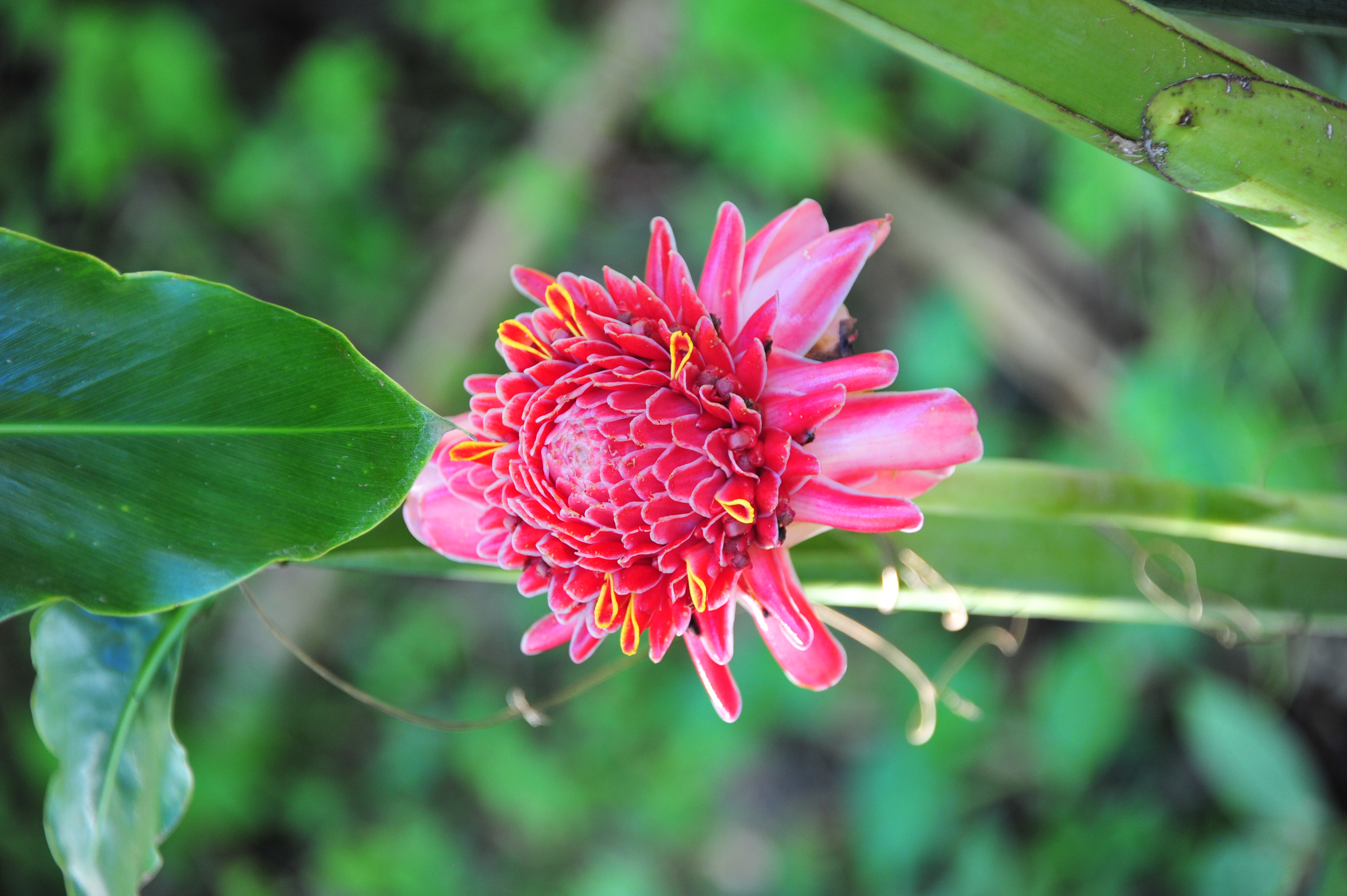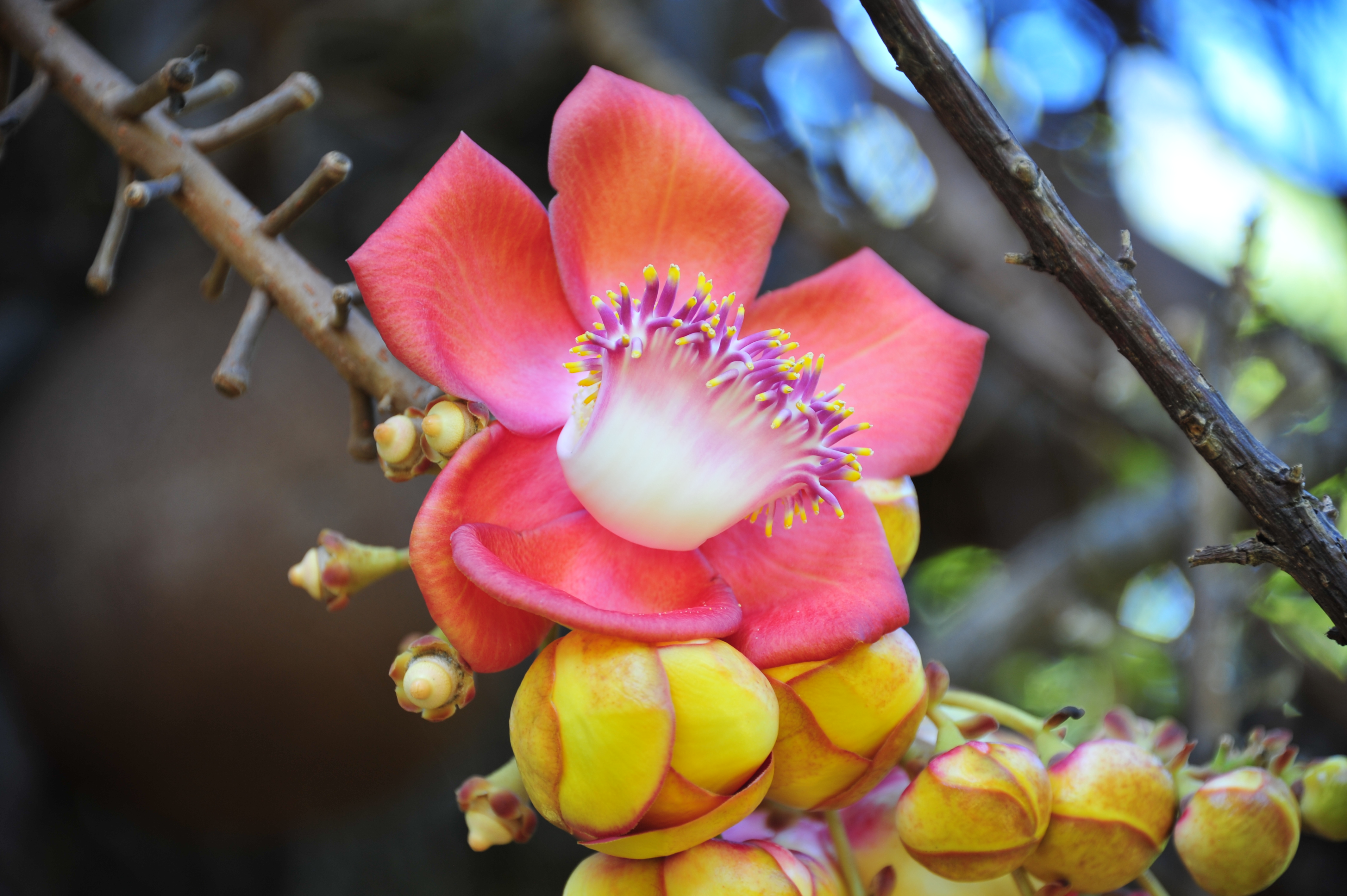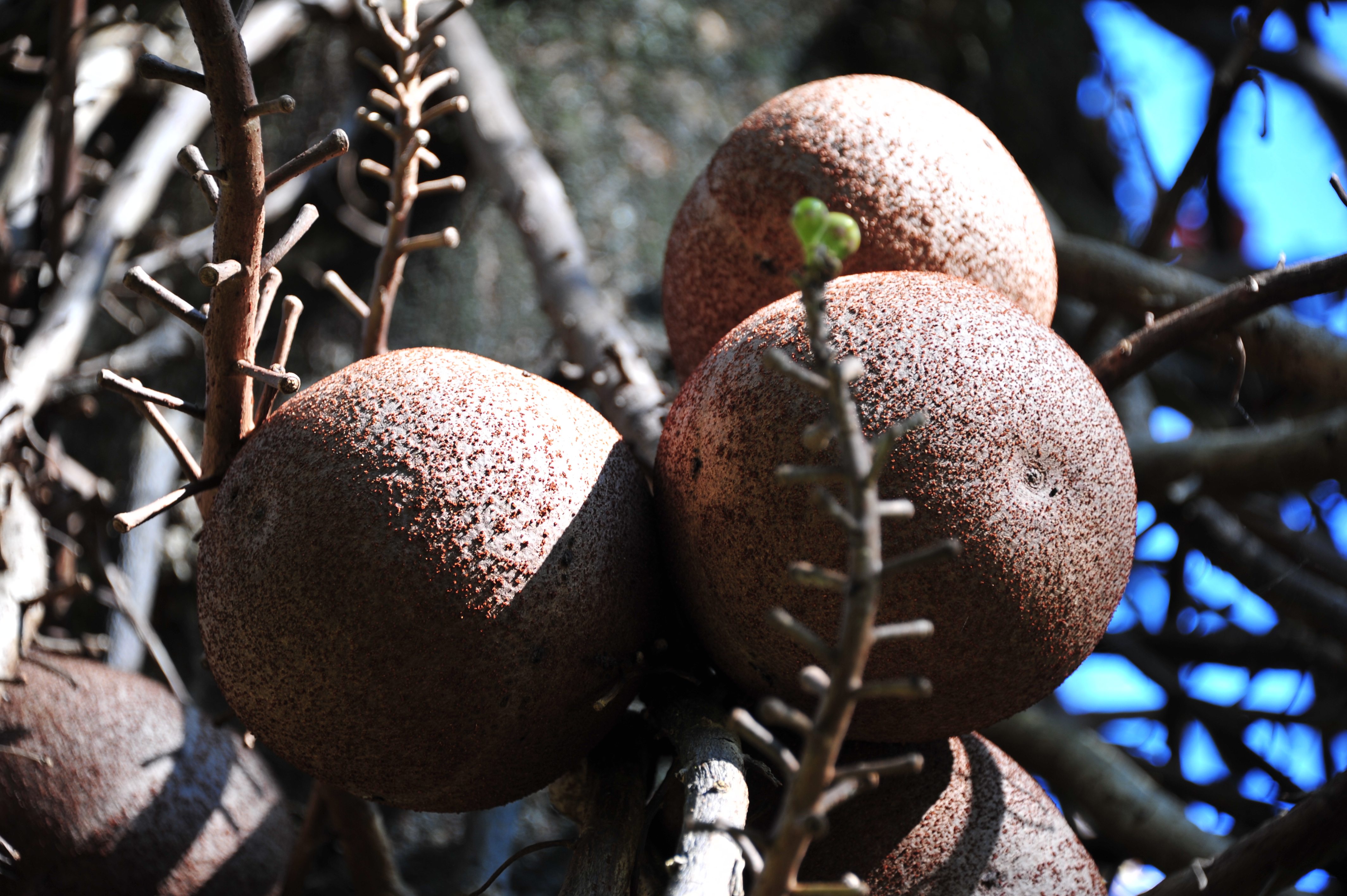 En arrivant nous découvrons une belle fleur qui pousse sur une liane le long d’un arbre. Il s’agit du couroupita ou arbre boulet de canon. Surprenant la fleur est énorme.