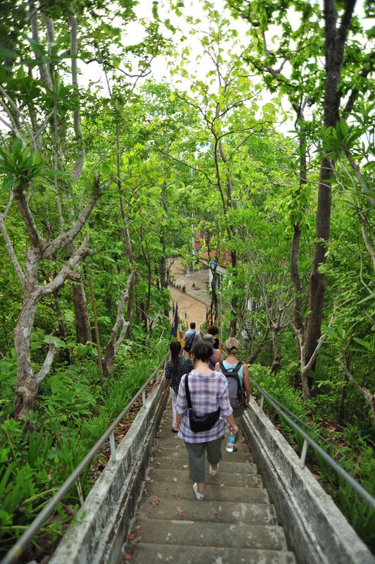 Ragaillardi par l’air du fleuve, nous nous lançons à l’assaut du Vat Phom Sambok. Quelques 300 marches nous mènent jusqu’au monastère bouddhiste qui domine la région. Bop Phany en profite pour nous instruire sur les fondements du Boudhisme Hymayana (dit “petit véhicule”)