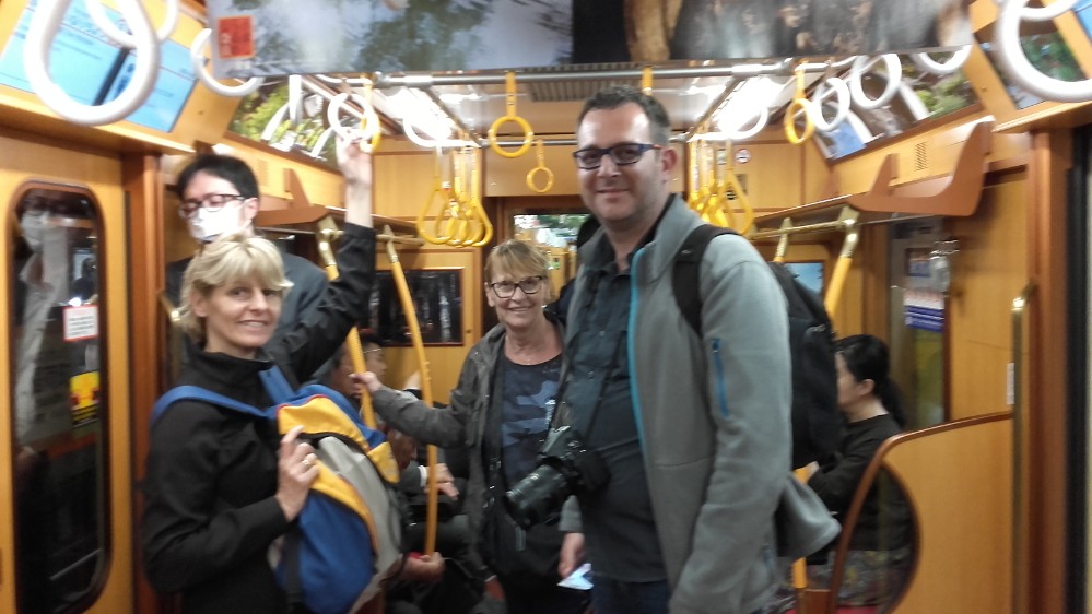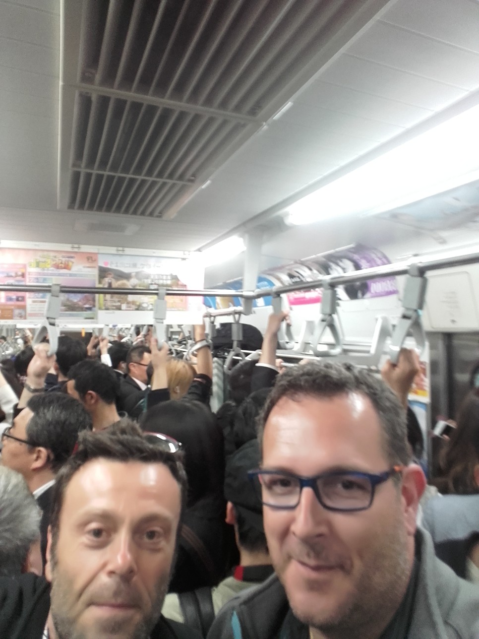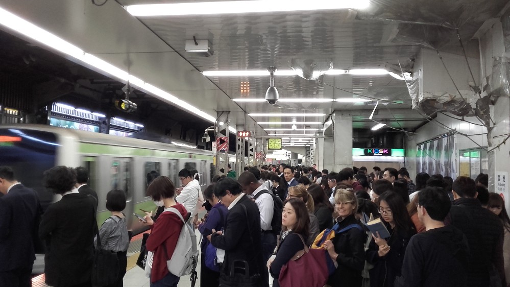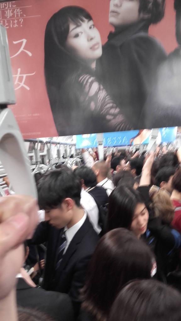 Retoir en train JR à une heure de pointe. Et ce n’est pas un mythe. Une persoñne sur le quai pousse les gens pour qu’ils tiennent a l’intérieur du wagon. Plus de place… mais si ca rentre !!!